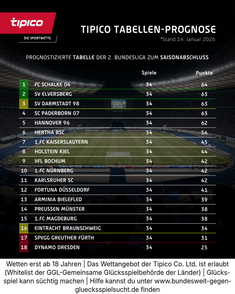 Die Tipico Tabellen-Prognose liefert zum Start der Rückrunde in der Bundesliga eine detaillierte Vorhersage zur voraussichtlichen Saisonendtabelle. Die Berechnungen basieren auf datengestützten Wahrscheinlichkeiten der jeweiligen Einzelspiele gepaart mit qualitativen Analysen.